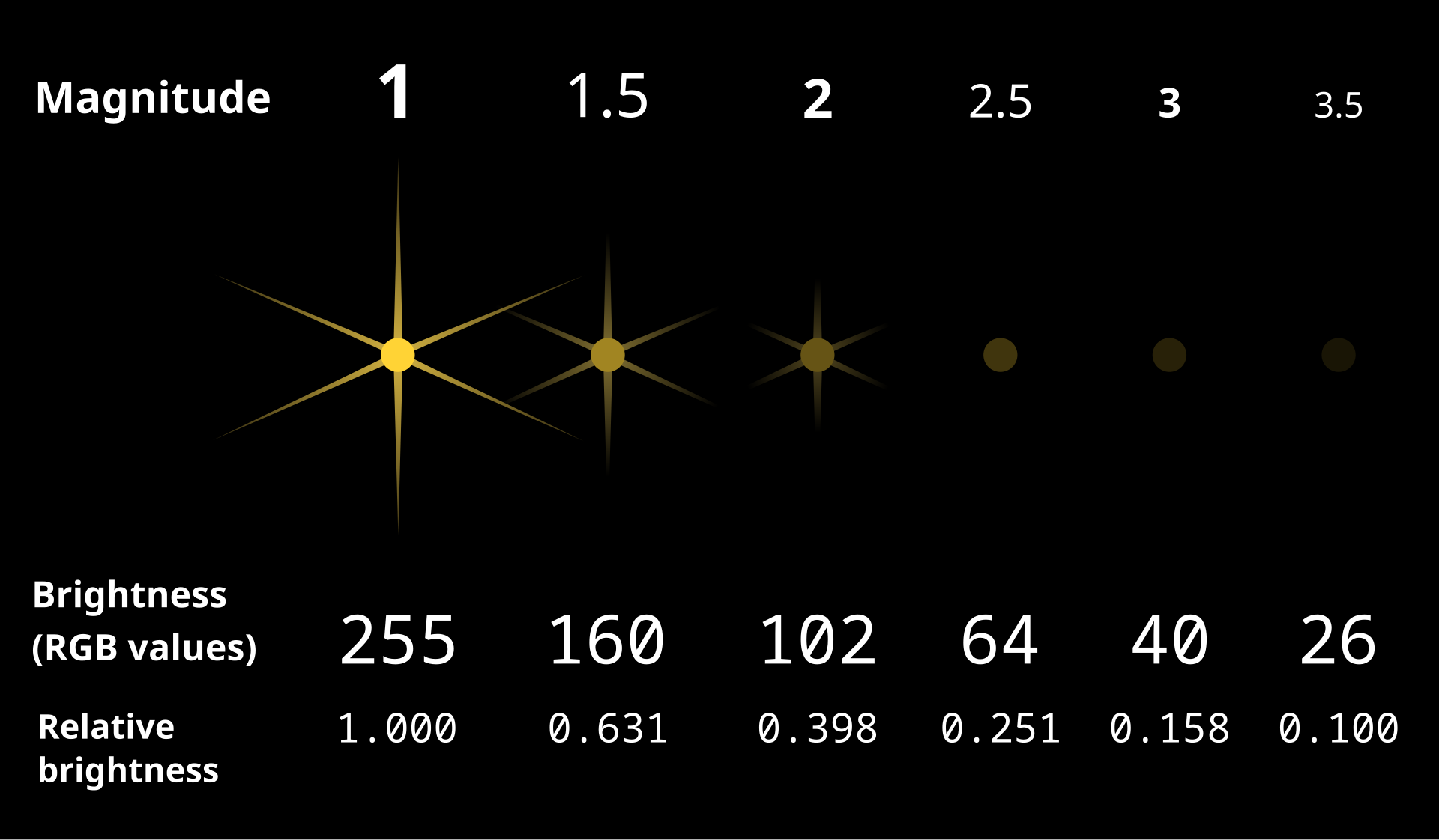 Como esta escala puede correrse hacia un lado o hacia el otro, para fijarla y que coincidieran con las usadas desde Hiparco se tomaron las magnitudes de Altair y Aldebarán como 1 (uno). Esta ecuación puede aplicarse a dos estrellas distintas: